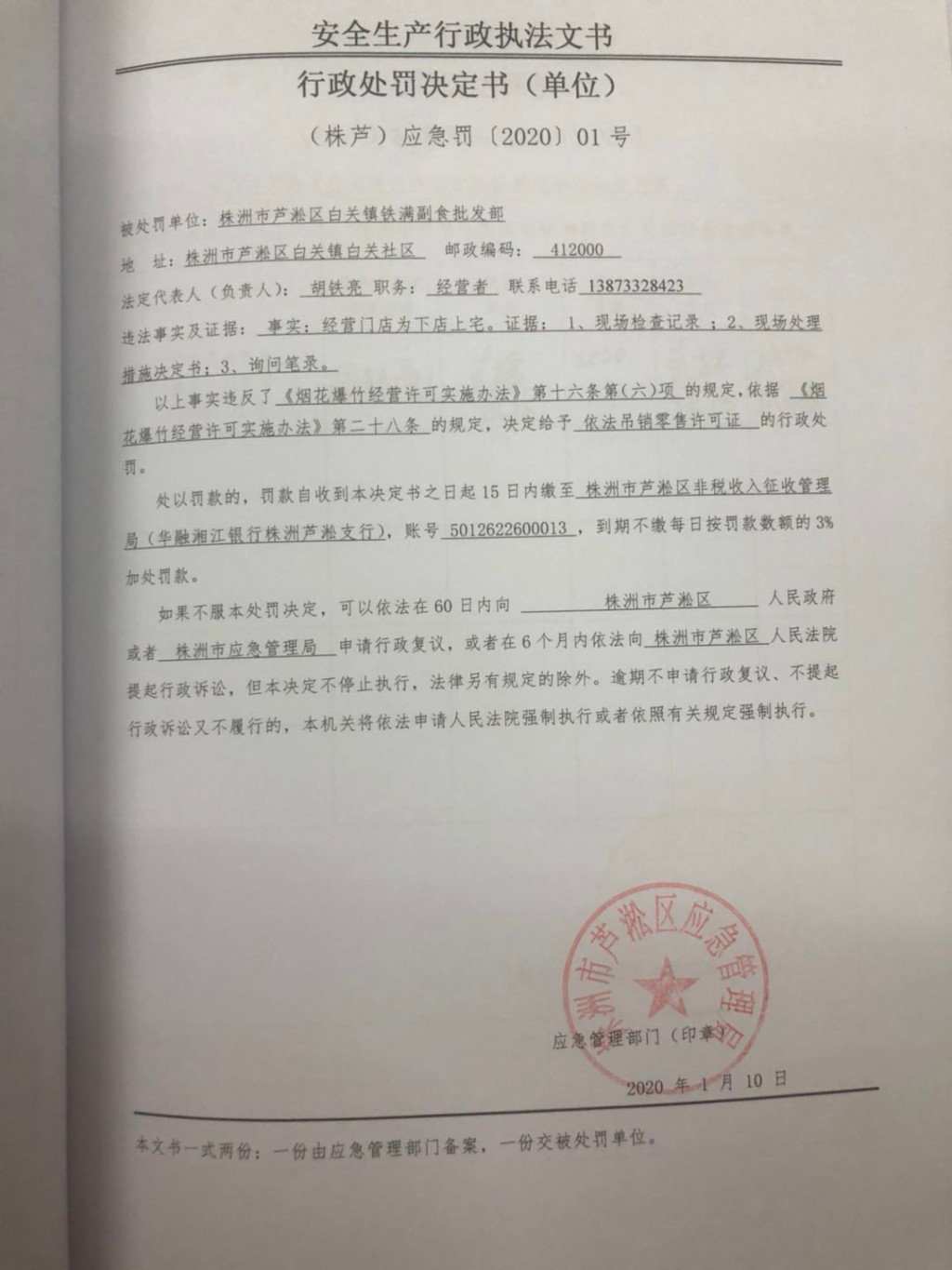 株洲市芦淞区白关镇铁满副食批发部改变经营条件吊销零售许可证
