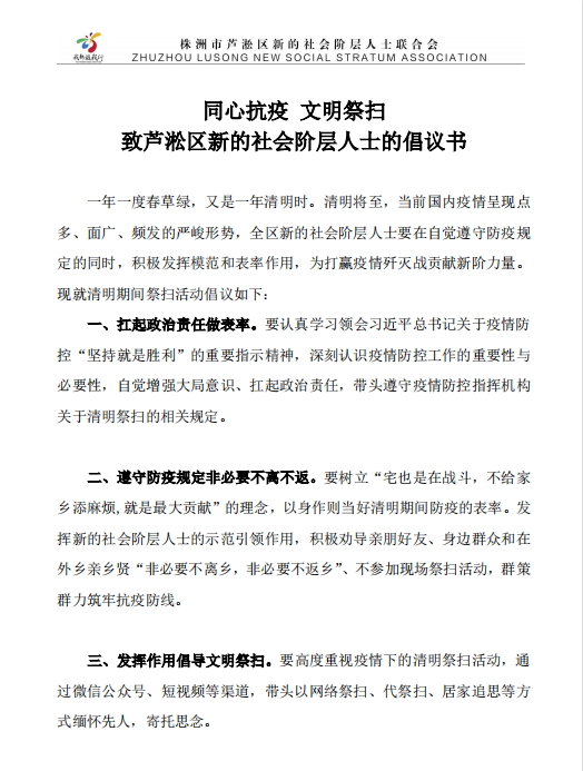 近日,芦淞区新阶层发布清明节文明祭扫倡议书,倡导广大新的社会阶层人士健康祭扫、安全祭扫、绿色祭扫,用实际行动践行文明新风、展现芦淞新力量!