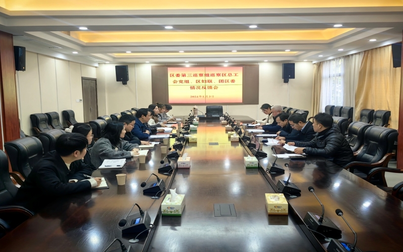 根据区委统一部署,2024年1月3日,区委第三巡察组向区总工会党组反馈巡察情况。区委常委、组织部部长、党校校长李石德出席会议并讲话,区委第三巡察组组长李团胜反馈巡察意见,区人大常委会党组成员、副主任,总工会党组书记、主席陈晓勇主持会议并作表态发言,区纪委常务副书记、区监委副主任王瑊、区纪委监委派驻总工会纪检监察组组长黄灿、区纪委监委党风政风监督室主任旷悦祎、区总工会党组领导班子成员参加会议。