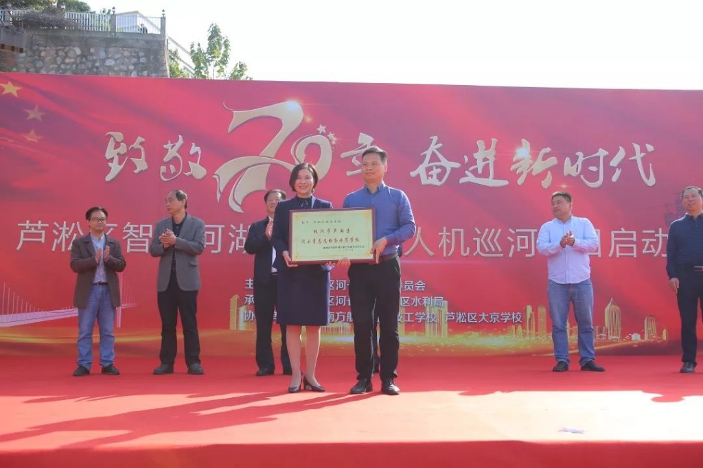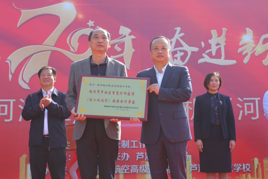 启动仪式上,株洲南方航空高级技工学校被授予“株洲市芦淞区智慧河湖建设(无人机巡河)政校合作单位”。杨晓江为株洲南方航空高级技工学校授牌并宣布项目正式启动。