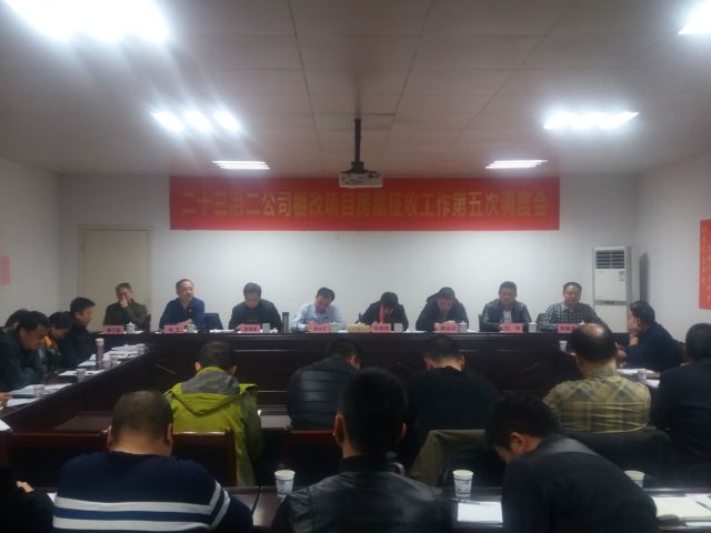 1月15日晚上7:30,二十三冶二公司棚改项目房屋征收工作第五次调度会在指挥部四楼会议室召开,市国有土地上房屋征收处处长殷钢梁,区领导冯湘玲、曹运社、杜益、廖文聪出席会议,参与征收工作的22个责任单位、公安、法院、征收中心、大塘冲社区以及指挥部综合协调组、政策法规组、政策实施组、资金保障组等部门主要负责人参会。会议由区委常委、常务副区长、项目指挥部政委稂水云主持。