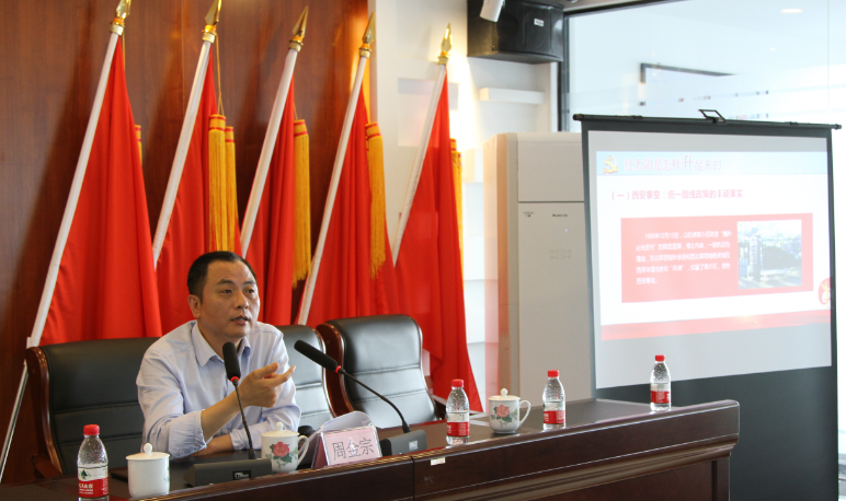 在授旗仪式结束之后,市委组织部党员教育中心主任、市“两新”工委专职副书记以《红太阳是怎么升起的》为主题,为参会的党组织书记和党员代表上了生动的一课。课堂上,周金宗引经据典,详细讲述了延安整风、敌后游击战、西安事变和皖南事变等历史事件和重要党史人物的生动故事,阐述了中国共产党的“红太阳”升起的艰辛而又伟大的历程。