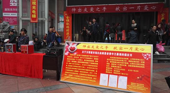智超时尚广场2楼17号商铺经营户曾中兰出生于攸县农村,早年丧夫,留下2个年幼的孩子,家庭的重担全压在她一个人肩上,她克服重重困难,靠银行贷款和朋友借款在智超市场租了个商铺经营服装,将两个孩子抚养成人。正当日子开始好起来的时候,病魔不幸降临在曾中兰身上,2016年3月17日经省直中医院确诊为急性非淋巴白血病,由于病情加重转入湘雅附一医院治疗,仅短短二十天时间已耗尽家中所有资金,且无力承担巨额医疗费用。