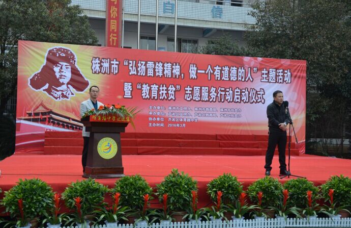 3月4日上午,株洲市“弘扬雷锋精神,做一个有道德的人”主题活动暨“教育扶贫”志愿服务行动启动仪式在芦淞区体育路中学隆重举行。市文明办主任欧阳元初、市教育局副局长李建国、市扶贫办开发办副主任谭帅、市教育局调研员晏贤明、芦淞区委常委、宣传部长文广平、芦淞区人民政府副区长曹运社等领导出席了活动。