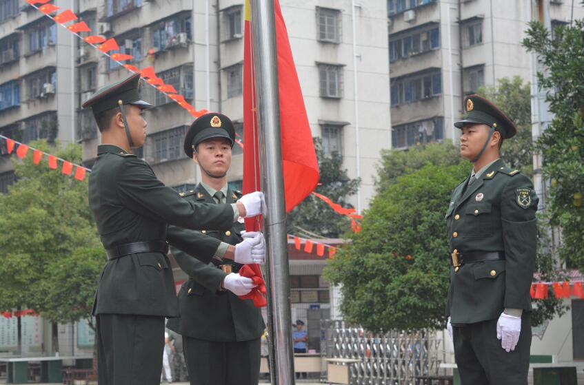 在升旗仪式上,12名武警官兵警容严整、精神抖擞地迈着矫健的步伐护送五星红旗步入升旗台。随着雄壮的《义勇军进行曲》响起,鲜艳的五星红旗冉冉升起。全体与会领导、嘉宾、师生在嘹亮的国歌声中,庄严肃立,目光随着国旗缓缓上移,用心倾诉自己对党、对祖国的无比热爱之情。
