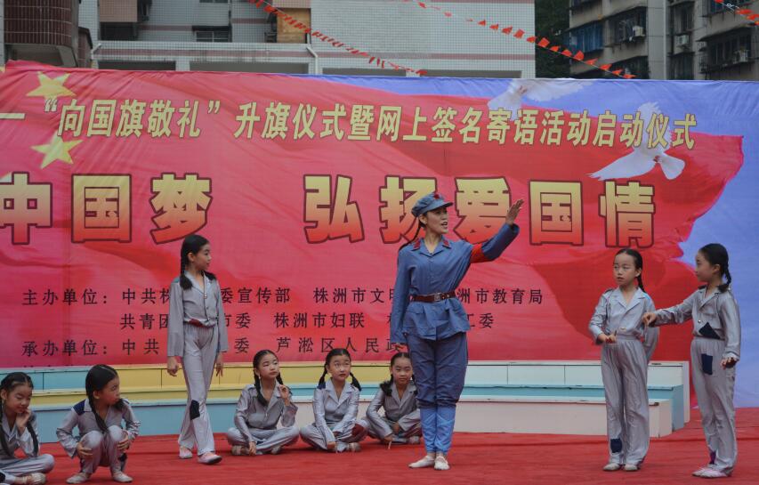 为纪念抗战胜利70周年、中华人民共和国成立66周年,株洲市宣传部、市文明办、市教育局、团市委、市妇联、市关工委联合主办了此次“向国旗敬礼”主题活动。