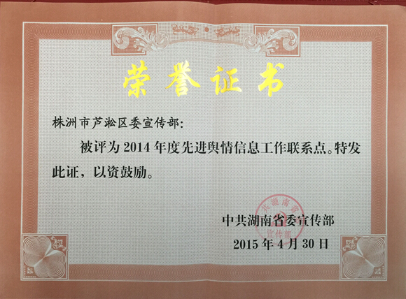 舆情信息调研工作是宣传思想工作的重要内容。2012年,芦淞区被正式确定为省委宣传部舆情信息直报点,为宣传推介芦淞经济社会筑建了良好的平台、开辟了快速通道。近日,芦淞区被评为“湖南省2014年度先进舆情信息工作联系点”,成为株洲市唯一获得此荣誉的直报点。