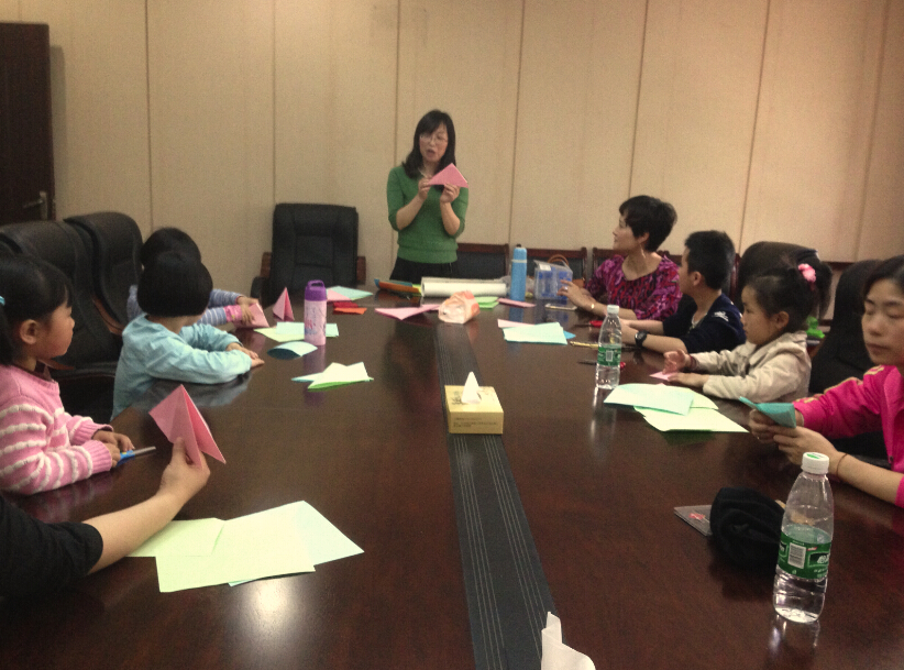 当廖老师在台上示范了三种热带鱼的折、剪方法后,孩子们便开始动手了。不一会儿,一条条大小不一的热带鱼就从孩子们的小手中“溜”了出来。随后,廖老师又拿出彩色笔,让孩子们发挥想象力,在折剪好的小鱼上画上自己喜欢的图案,有的家长在旁边还不时地提醒着自己的孩子画上他们平时所喜爱的颜色和图形,孩子们忙得不亦乐乎。一个小时后,经过孩子和家长们的精心打扮,那些身着艳丽衣服的热带鱼更加栩栩如生了。
