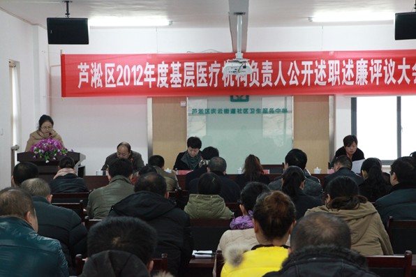 为进一步加强对基层医疗机构一把手的监督管理,督促基层医疗机构一把手严格规范自身行为,正确履职用权,促进本单位良性发展,根据省乡镇卫生院管理年关于乡镇卫生院长公开述职的有关规定以及芦淞区纪委在基层站所以及重点部门、重点岗位实行廉洁从政和行风建设公开评议的要求,芦淞区卫生局印发了《关于开展2012年度社区卫生服务中心主任、乡镇卫生院院长公开述职述廉评议工作的通知》,组织了这次公开测评大会。