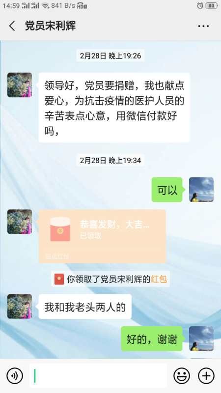 宋利辉、周海清党员夫妇通过微信主动捐款