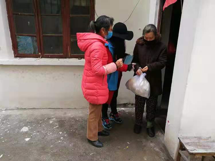 建设街道学堂冲社区计生协会小组长欧阳利华(左一)为辖区孤寡老人送物资
