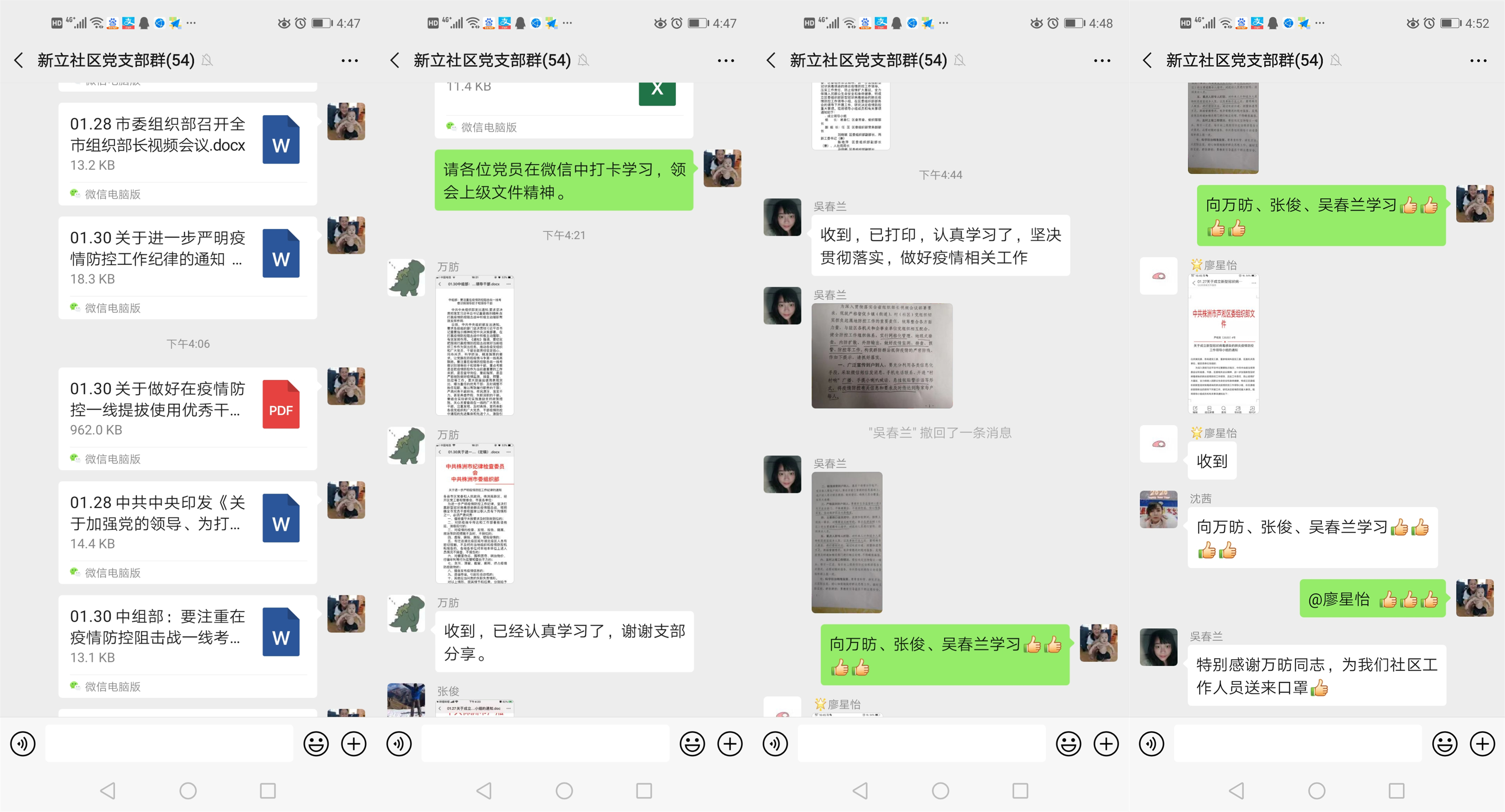 近日,新立社区党支部书记彭映玲在支部群里发布了上级部门印发的关于新冠肺炎防控工作指导性文件,为了帮助大家取得学习实效,她在群里鼓励党员进行打卡学习。特殊时期,为方便阅读有的党员将文件打印出来学习,还有的党员采取截图的方式在群里进行学习打卡,通过这样线上集中学习的方式,真正做到了党员学习“不脱节”。