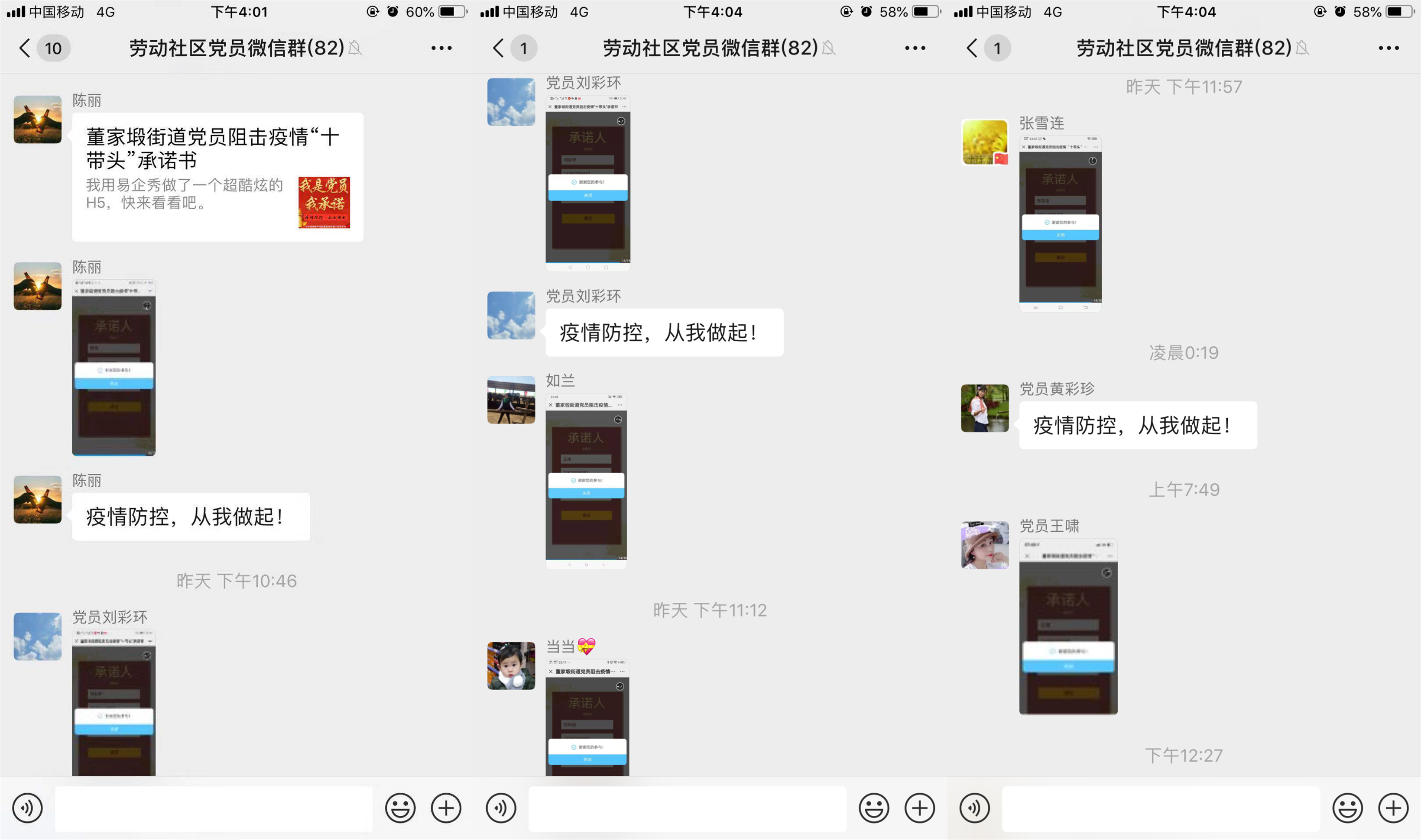 为号召党员在打赢疫情防控阻击战中发挥积极作用,劳动社区党总支书记陈丽以身作则,率先垂范,第一时间签订了电子版党员“亮身份、走在前、做表率”,阻击疫情“十带头”承诺书,这一举动,瞬间带动了群内党员进行签订,大家纷纷发送“疫情防控,从我做起”的响应。陈丽表示,通过党建引领,我们进一步坚定了攻克难关的信念。
