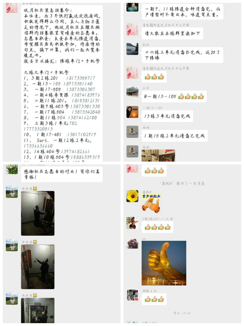 “现招募家里有喷壶的志愿者”这条紧急招募令在董家塅街道欣月社区“服务+监督”微信群里刚出现,便有居民主动询问、积极报名,不一会儿,共招募41名志愿者配合社区开展楼道消毒工作。