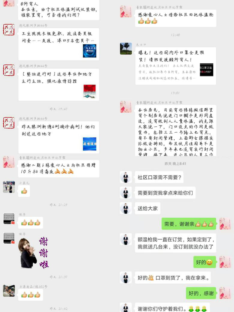 “群众的力量是无穷的,感谢!”欣月社区书记罗霞感叹道。近期,新型冠状病毒感染的肺炎疫情来势凶猛,类似这样的“求助”场景,几乎每天都会在董家塅街道“服务+监督”微信群里上演。面对群管理员发出的急寻体温检测仪、音箱、喇叭等各类求助,居民们慷慨解囊,争相向村(社区)提供力所能及的帮助。为社区填补体温检测仪紧急缺口的桂女士表示:“你们总是在为我们服务,这次算是可以帮到你们了。”