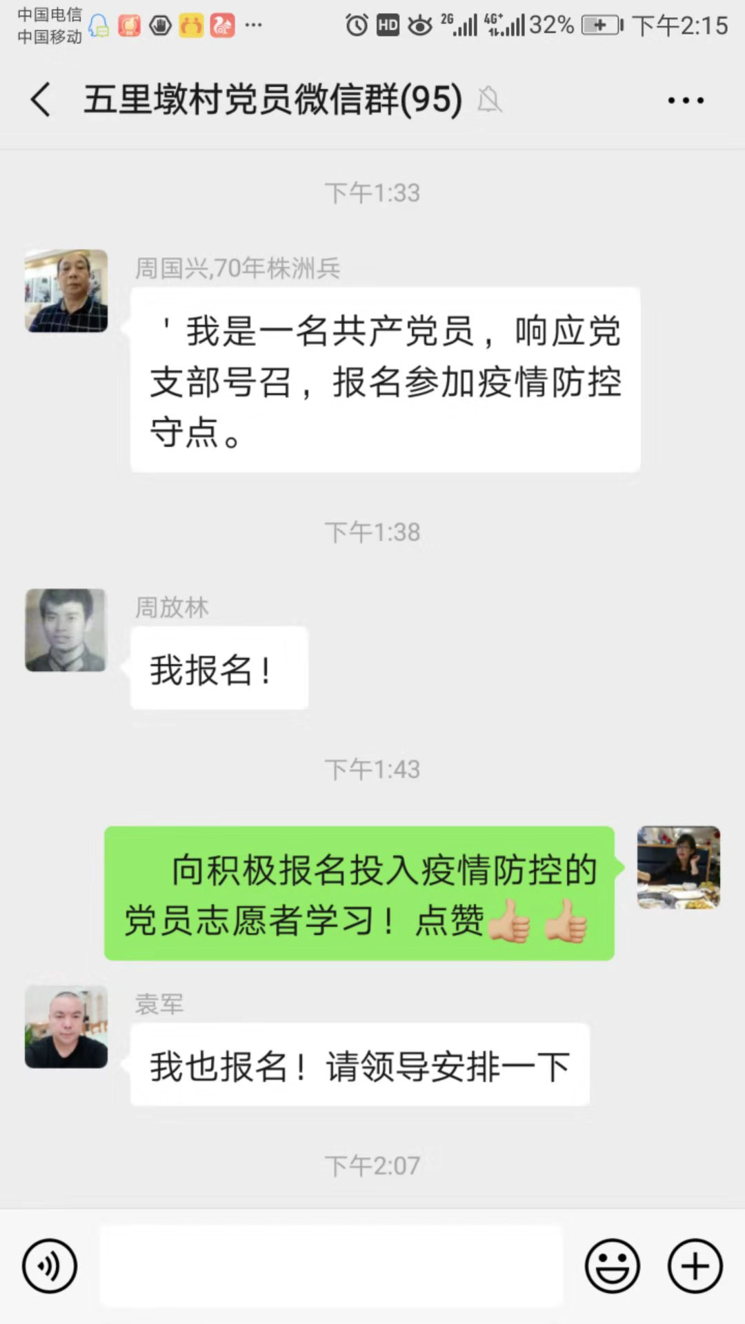 ·“我是一名共产党员,响应党支部号召,报名参加疫情防控守点。”——来自五里墩村党员微信群成员“周国兴,70年株洲兵”的发言。