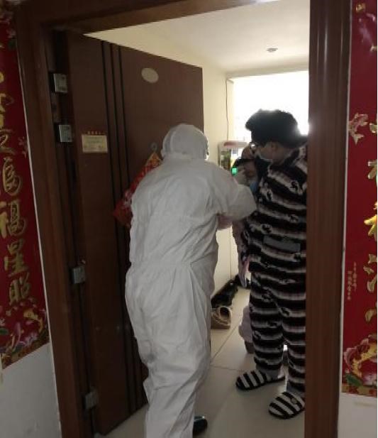 匡乖为密切接触者孕妇进行体温测量