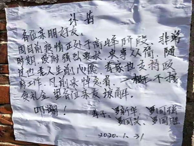 “各位亲朋好友,因目前疫情正处于高峰阶段,非常时期,政府强烈要求,丧事从简,随过世老人生前心愿,孝家也支持政府工作,凡前来悼念者,一概不接受礼金,望各位亲友谅解......”一则与以往不同的讣告出现在了芦淞区龙泉街道华兴村的公布栏。