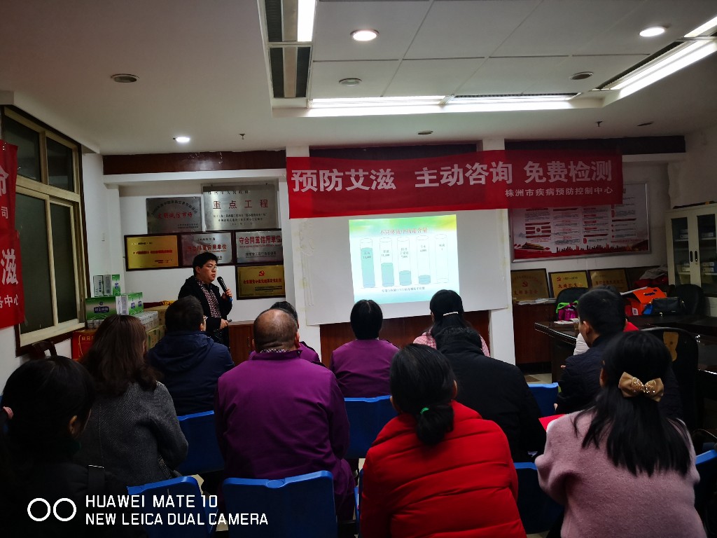 12月11日上午,芦淞区疾病控制中心为了增强流动人口防治艾滋病的能力和意识在建宁社区开展了流动人口艾滋病防治知识讲座。 讲座上,市疾控性艾科陈鹏专干仔细讲解了艾滋病的致病原理、发病情况、传播途径、防治措施等。让大家真正深刻了解艾滋病的危害和有效的防治措施。活动共悬挂宣传横幅5条,发放防艾小折页50份,发放安全套50盒,现场快速检测18人。