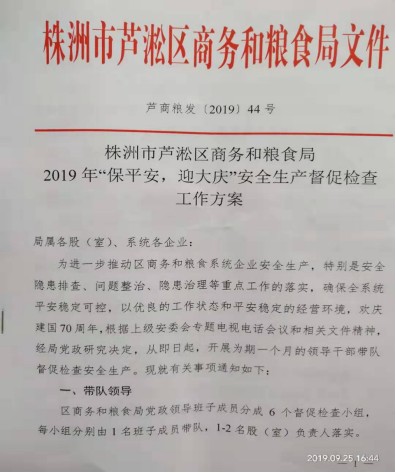会议学习传达了近期省、市、区关于安全生产、平安稳定相关会议精神,简要通报警示了湘潭县“9▪22”重大道路交通事故及初步调查处理的情况,重点就区商务和粮食系统“70大庆”前后的安全生产和平安稳定督促检查工作进行了安排部署。