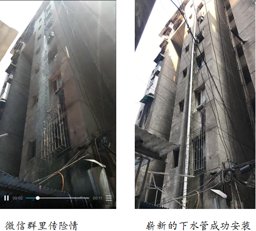日前,钟鼓岭社区龙山塘5栋微信群里居民传出一节险情消息:锈蚀的下水管部分脱落,留存部分摇摇欲坠,生活下水直接飘落,存在严重的安全隐患,给楼栋居民的生活环境带来恶劣影响。接到消息后,钟鼓岭社区创新服务方式,通过在楼栋微信群与居民进行300多条议事互动信息,发起两次微信群语音议事会,广泛征求意见,共商共谋,收集资金5000元。8月23日,在社区工作人员和居民代表的配合下,施工人员将残存的旧管道拆除了,一条全新的下水管道从九楼一直装到一楼,排除了安全隐患,解决了居民生活难题。