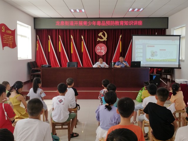 本次活动分成三部分,首先是由龙泉街道派出所社区民警李星屏跟大家讲课,课题内容以禁毒知识及青少年如何预防毒品知识为主,通过PPT课件、电视播放禁毒视频,发放禁毒宣传手册、禁毒宣传折扇、禁毒知识读本等方式,让学生们了解毒品,知道如何远离毒品。