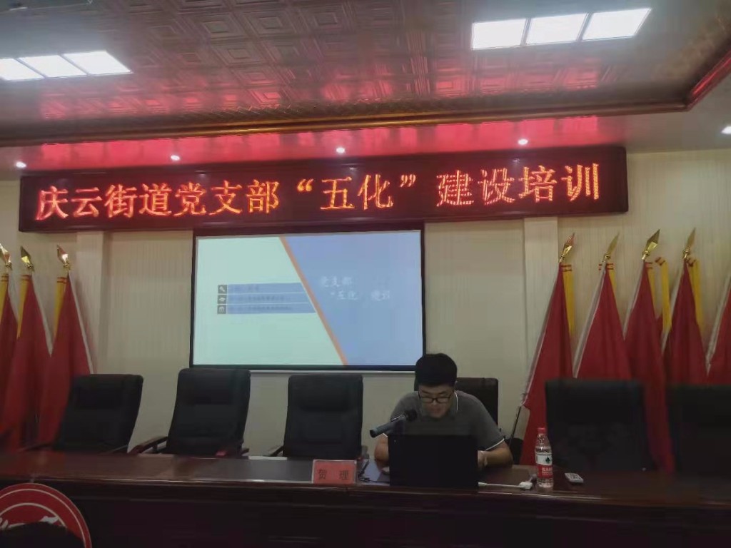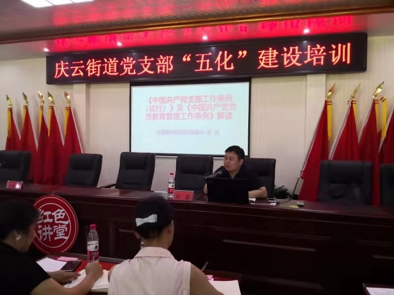 2019年7月25日上午,庆云街道党支部“五化”建设专题培训班在办事处四楼多媒体会议室顺利举行。培训邀请到市委组织部党代表联络办主任贺理和区委组织部组织组组长肖晶现场授课。庆云街道组织委员、党建工作站成员、各社区(村)党组织、两新党组织书记、委员、党建专干及下辖党支部书记参加培训。