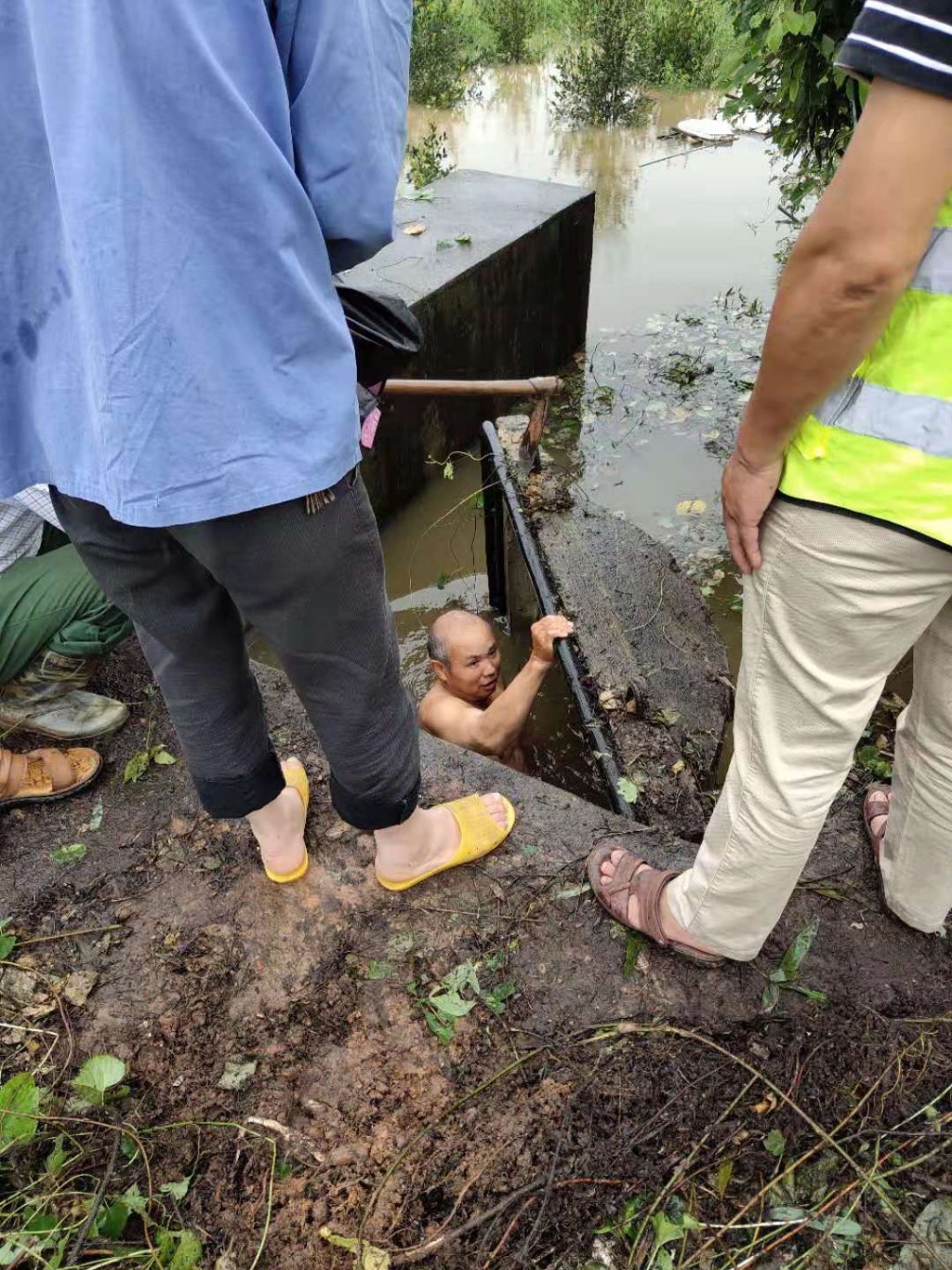 洪水倒灌,他潜入水中徒手关闸门。7月8日19时,枫溪街道湘江村洪水开始倒灌进堤内,导致部分农田、果树被淹。45岁曲尺村村民万飞雄接到应急救援响应后,自发加入抗洪抢险队伍中。洪水湍流且浑浊,需要人员下水排险,将闸门关上。此时,万飞雄迅速作出反应,在腰间绑上一根细绳,吸足了一大口气,跳入3米深的洪水中。几分钟过后,正当岸上的人都为他捏把汗时,几股水泡冒出了水面,万飞雄伸出了脑袋,喘了几口喊道:“杂物垃圾太多,堵塞了排水闸门,必须赶快清理干净。”随后,他稍作休息,再次潜入水中。万飞雄凭借多年工作经验和良好的水性,一点一点徒手清理掉闸门附近的杂草、垃圾,用尽全身力气努力将闸门关上。上岸时,万飞雄脸色和嘴角都已发白,身体瑟瑟发抖。他还淡淡地说了一句:“没事,哪里有险情,我还能上。”