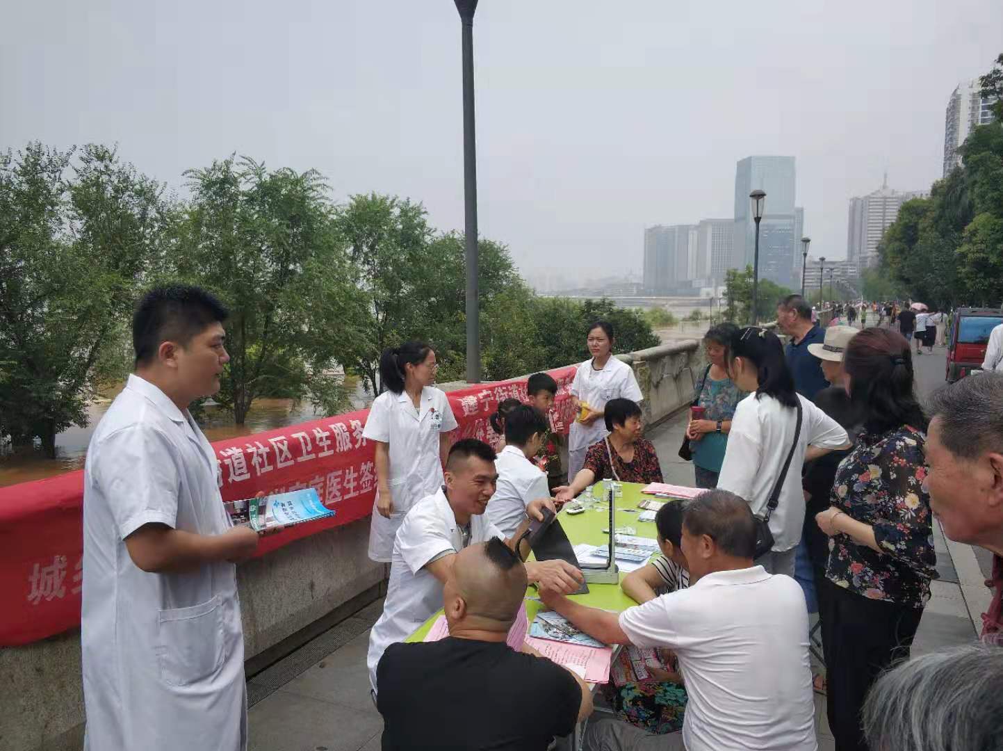 近日,株洲普降暴雨,芦淞区建宁街道部分地区受灾严重,为了提高辖区群众的汛期防病意识和自我保护能力,7月10日上午,建宁街道社区卫生服务中心医疗团队在九天国际沿江风光带进行汛期防病知识宣传及家庭医生签约服务。