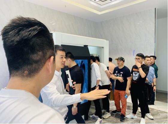 随后考察团前往白关服饰产业园参观考察。在二狼狐轩公司总部,企业家们现场体验了狐轩的智能量体裁衣设备,该设备能在5秒内对客户完成智能测体,并通过所连接的智能生产线在20钟内完成个性化的服装制造。