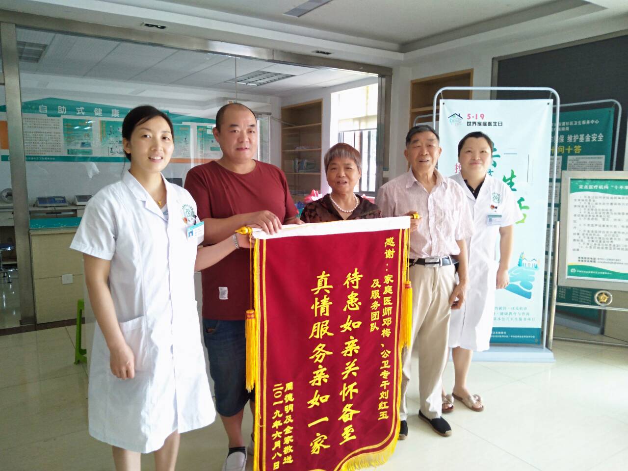 6月10日,79岁的老人周德明将一面写有"待患如亲关怀备至 真情服务亲如一家"的锦旗亲自送到芦淞区庆云街道社区卫生服务中心家庭医生邓梅团队的手中,对家医团队一直以来对他的健康管理和细心服务表示诚挚地感谢。