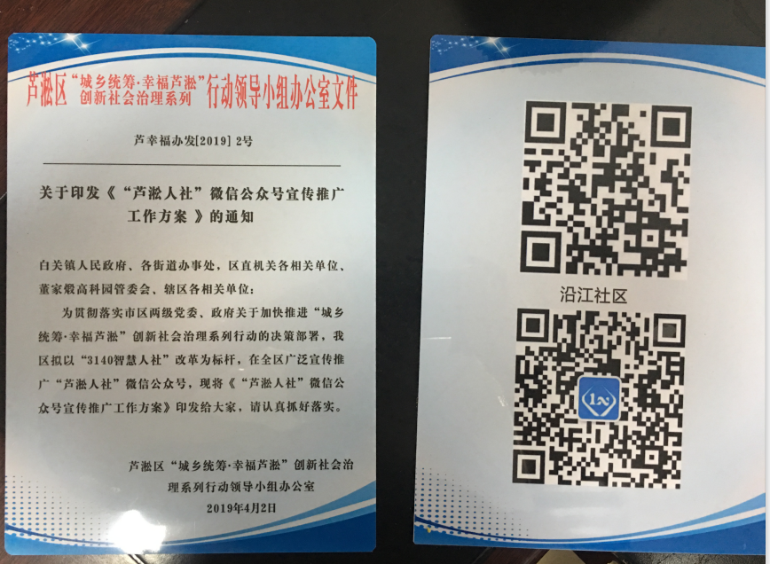 针对社区反映的在走访上户进行宣传推广的过程中,群众对于扫码关注不信任的问题,及时向街道领导汇报,并提出解决方案。为社区所有工作人员制作工作牌,并在工作牌的背面印上“芦淞人社”、“芦淞宣传”、“建宁先锋号”的官方二维码;另外分社区单独制作了一批一面印有《关于印发 的通知》(芦幸福办发[2019]2号)红头文,另一面印有各社区专属推广码及“芦淞人社”官方二维码的宣传板,放至工作台面醒目位置,为上户走访进行宣传推广时取得群众信任增加可信度。
