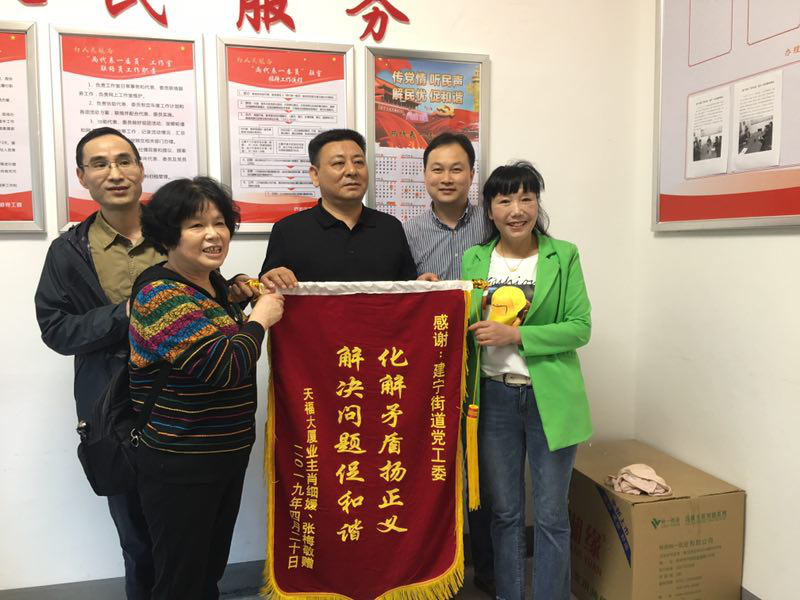 近日,辖区居民张梅、肖细媛将一面写有“化解矛盾扬正义,解决问题促和谐”的锦旗送到建宁办事处,她们感谢街道工作人员站在公正的角度为她们处理问题,并对党工委书记朱国荣、办事处主任刘晓波耐心细致的工作服务态度给予肯定。