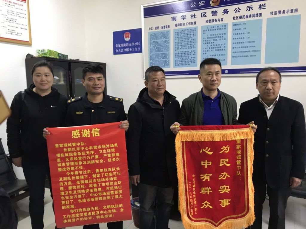 4月15日上午,中心农贸市场管理方和水果疏导区20余名经营户齐聚董家塅街道城管中队办公地,并推选经营户代表张师傅、李师傅为城管中队送上锦旗和感谢信。株洲新闻频道、法治频道、1012广播电台相继在现场跟踪报导。张师傅面对记者采访激动的表示:感谢党和政府,感谢董家塅街道和城管中队,让我们终于可以不用打游击式的摆摊,也正是他们的执政为民、文明执法,让我们改正了不文明摆摊的陋习,市场周边的环境越来越好了。街道城管办主任荣幸向媒体记者讲到设立临时疏导区的初衷:在抓好城市综合管理工作的同时,必须充分考虑到民情民意。采取以人为本、疏导结合,规范有序经营的管理方式,科学合理设置疏导区,达成街道城市综合管理工作、经营户、居民的各方需求。