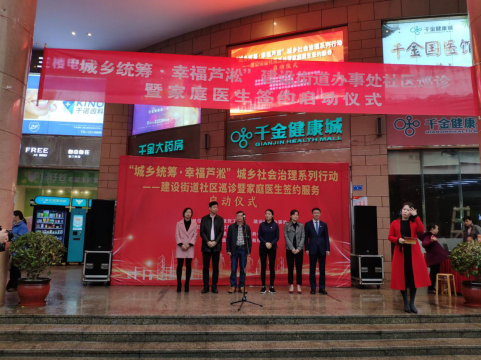 为切实推进“城乡统筹.幸福芦淞”创新社会治理系列行动,最大可能满足社区居民对健康生活的需求,提升居民群众的获得感、幸福感。3月28日上午,何家坳社区在千金文化广场前坪举行社区巡诊暨家庭医生签约服务启动仪式,区人大常委会党组书记、主任肖支前、区人民政府副区长段可文、区卫健局党委书记万飞燕、建设街道党工委书记林子其、办事处主任王彬、湖南千金大药房连锁有限公司总经理罗凯出席了此次签约仪式。