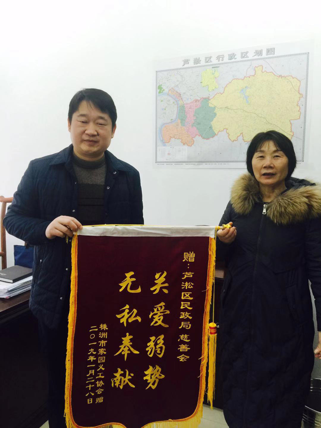 3月1日上午,芦淞区和谐家园义工协会刘建香将一面红底金字的锦旗送到了区民政局局长、慈善会秘书长吴新泉办公室,上书“关爱弱势,无私奉献”,代表和谐家园全体住户对区慈善会常年帮扶和谐家园困难家庭表示诚挚的谢意。
