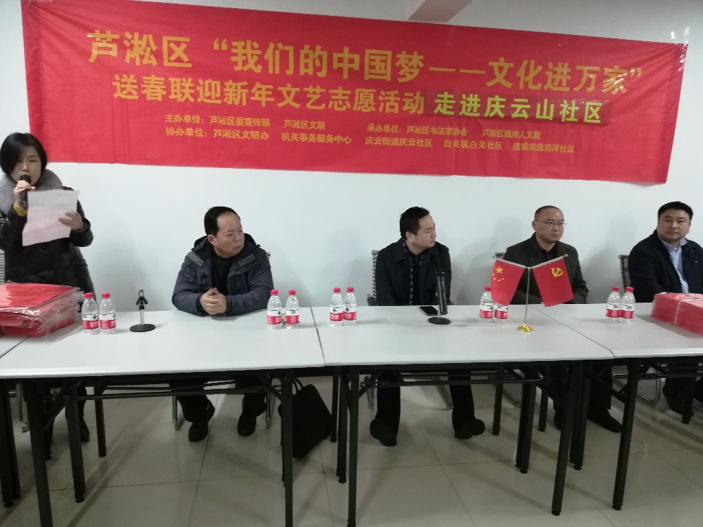 2019年1月15日上午9点,庆云街道办事处联合区宣传部、文联组织开展主题为“我们的中国们——文化进万家”的送春联迎新年文艺志愿活动。活动邀请到芦淞区委常委、宣传部长喻华军莅临现场,街道办事处党工委书记颜良青、人大主任李跃辉、庆云山社区工作人员等20余人出席。