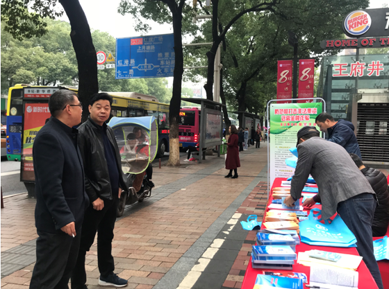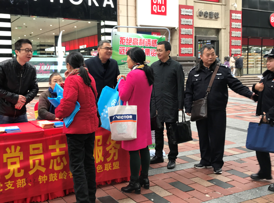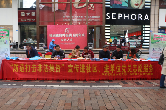 11月19日,在王府井广场,芦淞区政府政金办党支部结合“在职党员进社区”服务活动,联合建设街道钟鼓岭社区党支部及其辖区各“红色联盟”单位党支部党员在钟鼓岭辖区开展“防范打击非法集资”宣传进社区、进单位党员志愿服务活动。芦淞区政府政金办党支部书记、主任陈鹏,建设街道党工委书记林子其,建设街道办事处主任李强参加本次党员志愿服务活动,并指导本次宣传活动工作全部过程。