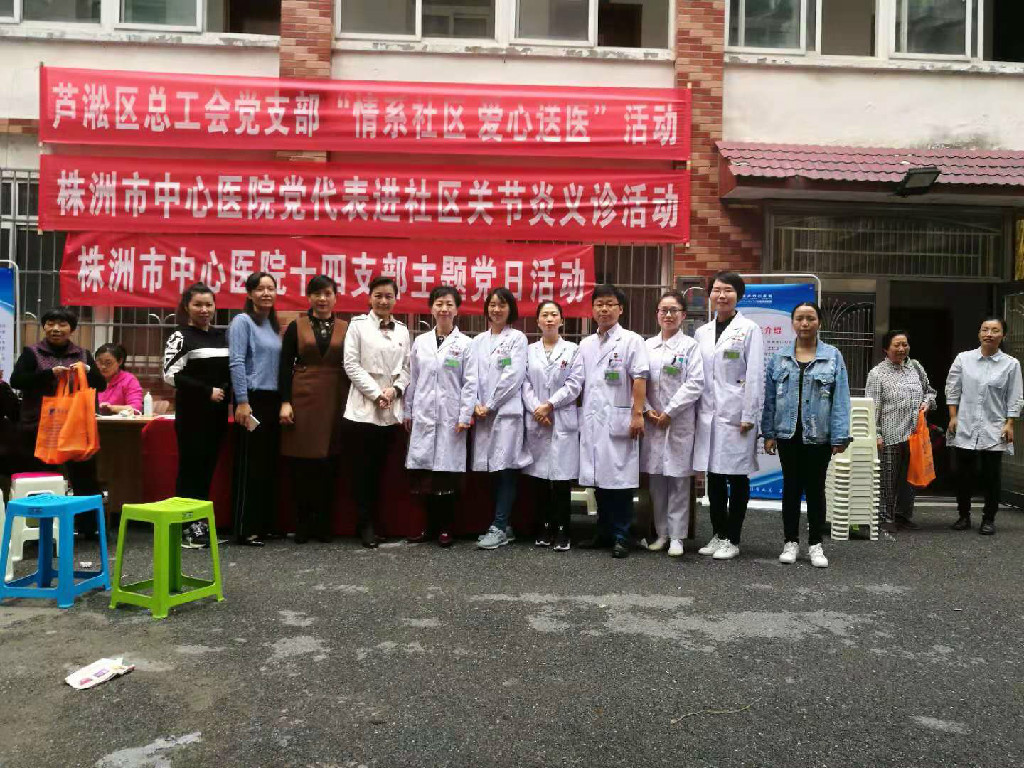 10月10日下午,在贺家土街道大塘冲社区,芦淞区总工会党支部与株洲市中心医院第十四党支部联合开展了“情系社区 爱心送医”活动。5位来自市中心医院风湿免疫科的医生为社区150多位居民进行了义诊、医学检查和健康讲座及咨询。