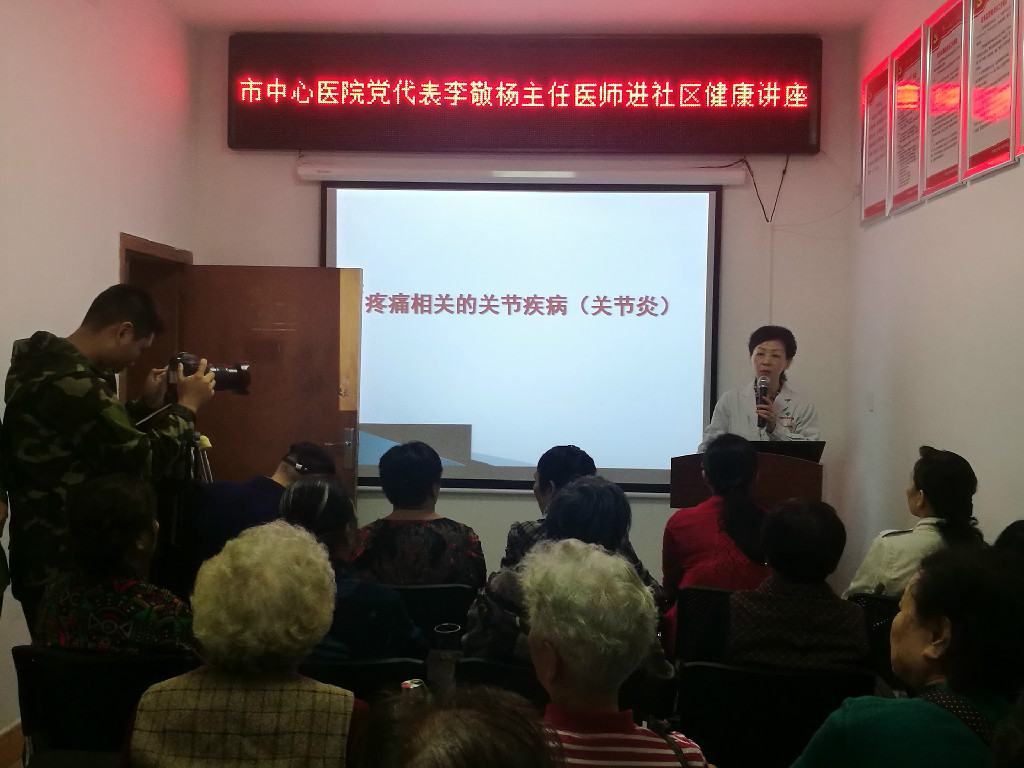 10月10日下午,李敬扬医生组织市中心医院第十四党支部的5名医生、两名护士来到大塘冲社区,为社区群众送医上门。当天中心医院的医生们分别为居民朋友进行血压、尿酸、骨密度等检测,对前来参加体检的居民讲解定期检查身体的重要性、耐心解答居民各种健康咨询、并对检测出身体有异常的居民生活方式提出改善建议。李敬杨主任医生除亲自健康讲座外,还为一些关节炎患者进行了现场看诊。