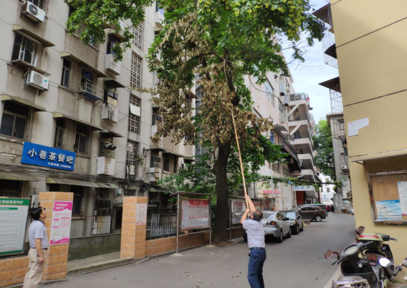 不久前,何家坳社区斜对面的大树上悬挂着一颗较大的枯枝,有随时要掉下来的风险,大树底下就是社区居民经常出入的道路,如果不处理,易造成枯枝掉落砸伤居民,砸坏车辆的恶性事件。