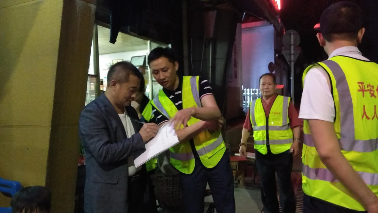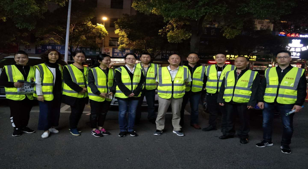 4月18、20、23日晚七点,区商粮局领导率先垂范,局长夏志毅、副局长谭小辉、贺鹏军领队,街道及社区志愿者每组共12人集合在庆云派出所门前,身穿反光马甲,重点巡防在辖区内背街小巷、无物业管理居民小区和人员密集商铺集中的重点路段,进店入户宣传综治民调和平安创建工作,告知民调内容、答问技巧及注意事项,督促商户提高安全防范意识,提示居民防火、防盗、防诈骗等,并在走访中收集社情民意,及时发现和制止非法、违法行为。