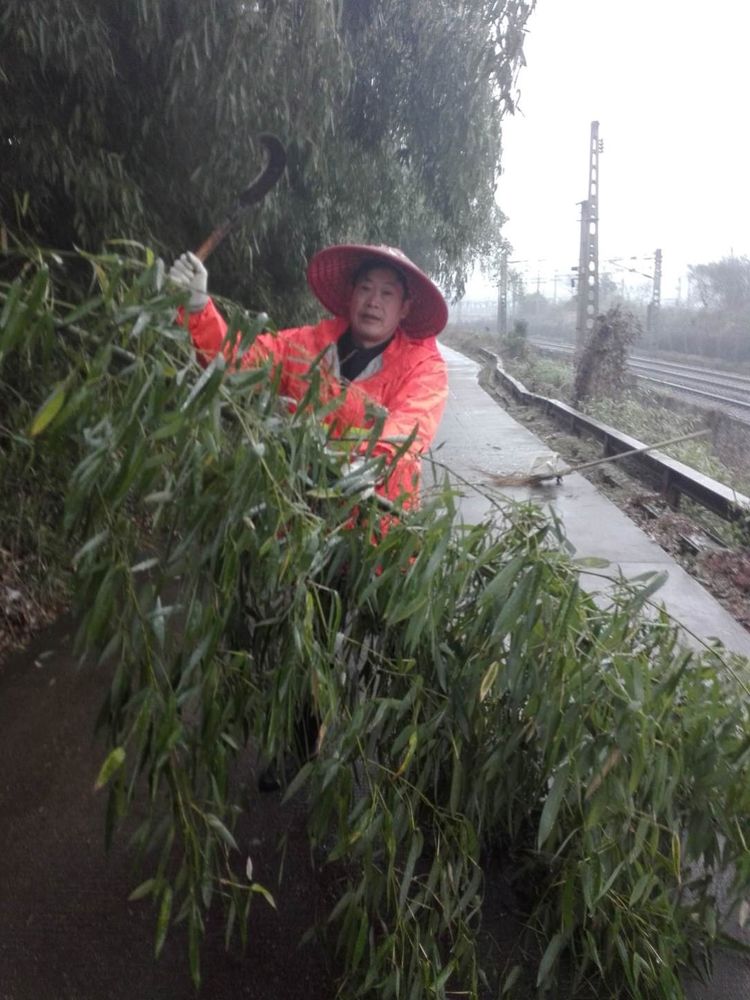 在坚栗村组织的扫雪队伍中,还有一位志愿者,他以一个普通群众的身份,在冰天雪地中默默的走上村道,义务清除沿线树木断枝,并将压在树上的冰雪拍落下来,以防冰雪压断树枝危害行人安全。
