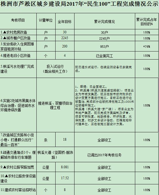 根据株洲市统计局《关于认真做好2017年全市“民生100”工程数据评估认定的通知》要求,现将区城乡建设局承担的各项目标任务完成情况公示如下,社会各界人士如有异议,可通过来信、来电、来访及发送电子邮件的方式向区考核办、区统计局反映,区考核办联系电话28580529,区统计局联系电话28580779。