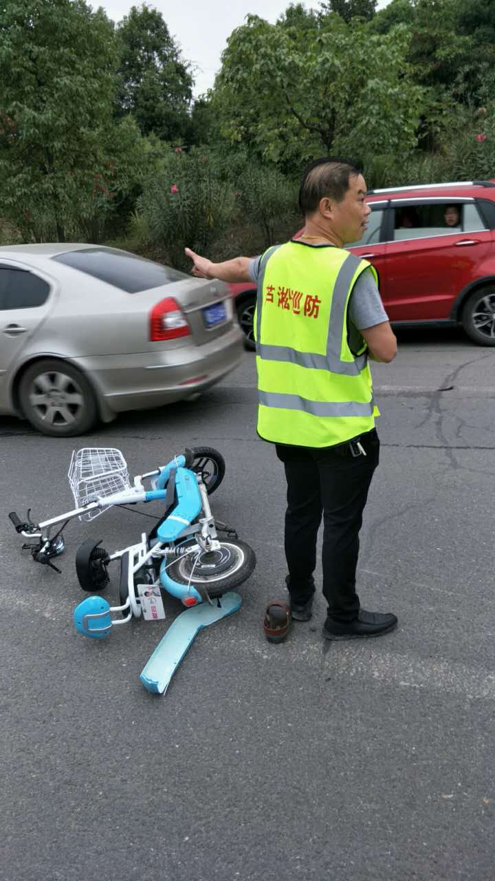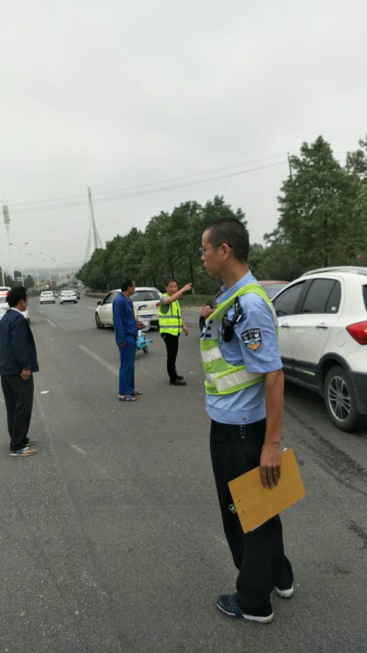 2017年9月4日上午7点15分,曲尺村义务巡防队队长唐指挥一行,在巡视重点路段——南环路曲尺段时发现该路段交通堵塞严重,忙奔到车流源头,原来是发生了一起交通事故,一名骑电动车上学的学生在横穿马路时与一辆直行的摩托车相撞,唐指挥见状马上组织巡防队员设置路障,对现场交通进行管控,同时将受伤人员扶至路边安全地带,再拨打122报警。直到交警赶到现场时,巡防队员仍继续在事发地点指挥交通,使交通恢复畅通,并提醒过往车辆注意安全。