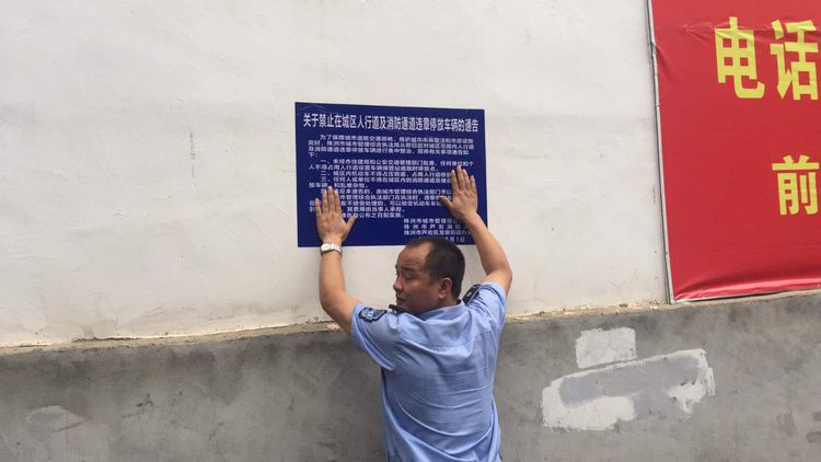 城管队员在各路段及场所张贴严禁在人行道违章停车的通告