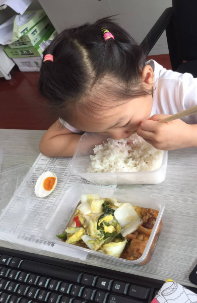 街道工作人员带着小孩在值班室吃盒饭