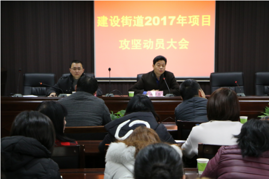 2月6日下午,建设街道召开2017年项目攻坚动员大会,会议由街道办事处主任李强主持,办事处党工委书记林子其、街道各拆迁小组全体成员参会。