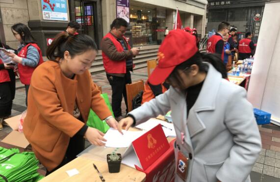 工作人员发放环保袋