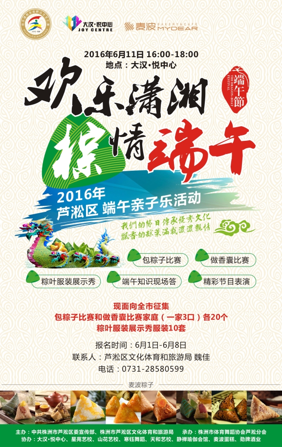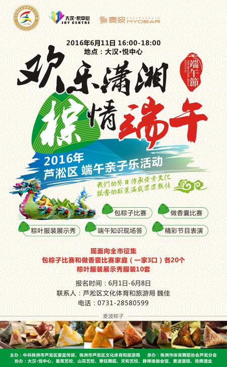 芦淞区端午亲子乐活动是芦淞区“欢乐潇湘”群众文化活动和“我们的节日”系列主题活动的重要活动,旨在传承中华优秀文化,引导人们认知传统、尊重传统、弘扬传统,增进爱党、爱国、爱社会主义情感。活动由中共株洲市芦淞区委宣传部、株洲市芦淞区文化体育和旅游局主办,株洲市体育舞蹈协会芦淞分会承办,将于2016年6月11日下午在大汉·悦中心举行。活动内容包括包粽子比赛、做香囊比赛、粽叶服装展示秀、端午知识现场答和市体育舞蹈协会芦淞分会各成员单位进行的精彩节目表演,可谓是内容丰富、具有特色,适合任何人员参与。麦波蛋糕和劲牌酒业也为活动准备了丰厚的奖品和奖券,只要您参与就可获奖。